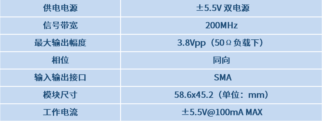 该四通道加法器具备四路输入通道(IN1、IN2、IN3、IN4),输出为单路OUT端口。输入与输出均为50Ω阻抗匹配设计,模块最大带宽可达200M,板载电源均为超低噪声线性电源,确保信号完整性与系统兼容性。